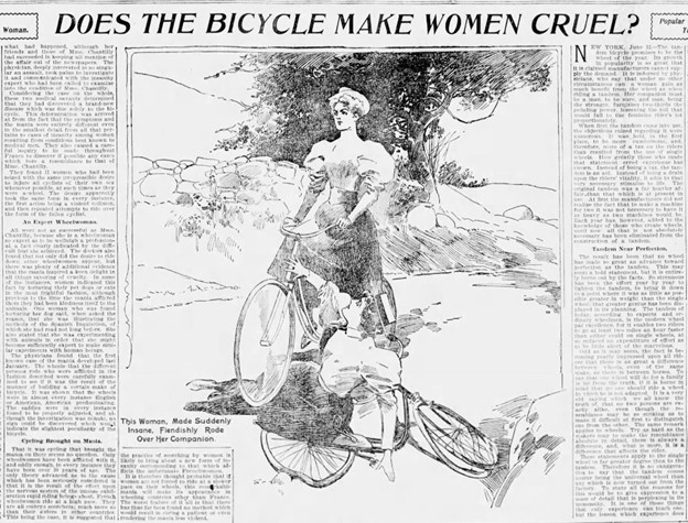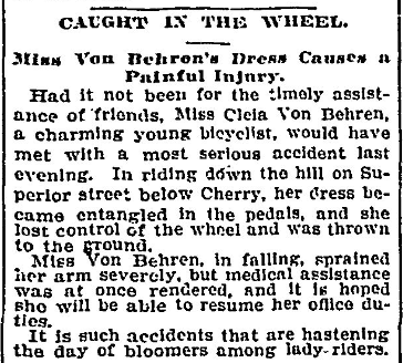 Women’s fashion in 1890s was dictated by long skirts, bustle bands, and stiff corsets. This style often causes painful accidents and injuries, so women cyclers began adopting a new fashion known as “bloomers” or “knickerbockers.”