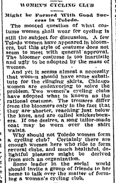 Despite the controversy, the bloomers and bicycles craze took off in Toledo and by 1895, women were forming their cycling clubs and taking solo trips around the world. Bicycling is so much more than a fun sport and hobby – it helped pave the way for women’s rights and freedom. In the words of Frances E. Willard, who literally wrote the book on bicycling: “I began to feel that myself plus the bicycle equaled myself plus the world.”
