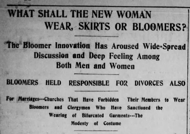 First popularized by women’s rights activist Amelia Jenkins Bloomer in 1851, bloomers were a bifurcated garment that were worn under dresses. This style was not without controversy – many considered the bloomers “immoral” and “homely.”